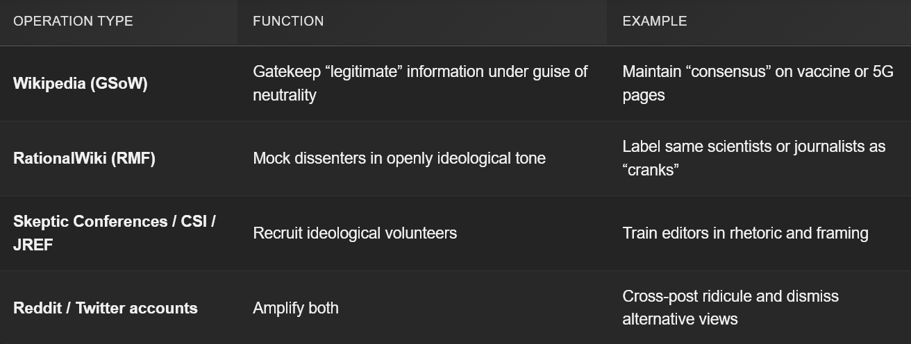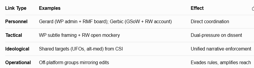 This network turns “skepticism” into gatekeeping: GSoW manufactures Wikipedia consensus; RMF weaponizes it via shame. It’s resilient due to deniability (volunteers, no formal ties) but vulnerable to exposure of patterns (e.g., edit histories, lawsuits).